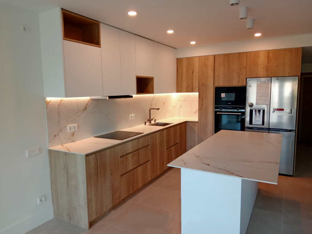 Cuina en forma de L amb illa, realitzada amb mòduls alts lacats en blanc i mòduls baixos i columnes en melamina de roure.