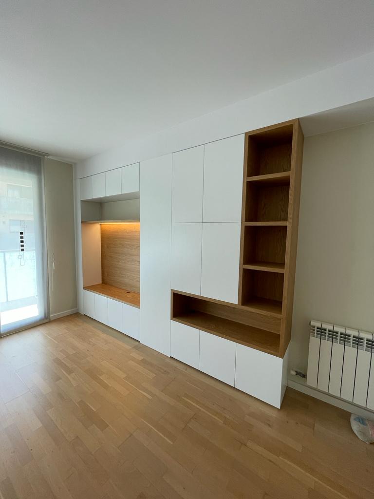 Moble TV fabricat totalment a mida pel nostre client. El moble de línia rectes queda integrat al llarg de la paret i queda de manera uniforme i lineal. La combinació de materials lacat en color blanc i roure aconseguim calidesa i lluminositat.