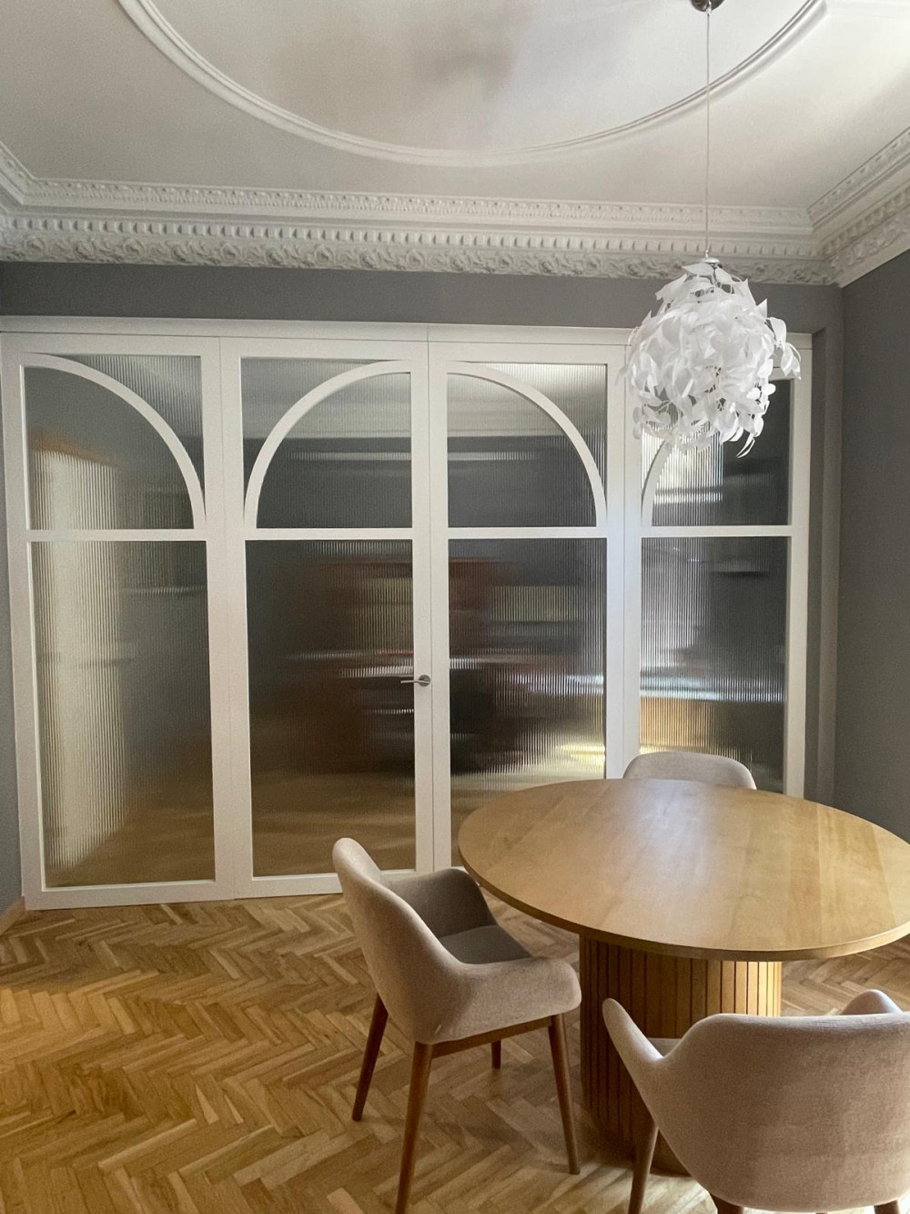 Tancament vidriera amb dues portes centrals i dos fixos laterals. Tot realitzat en DM lacat i vidre acanalat laminat.
